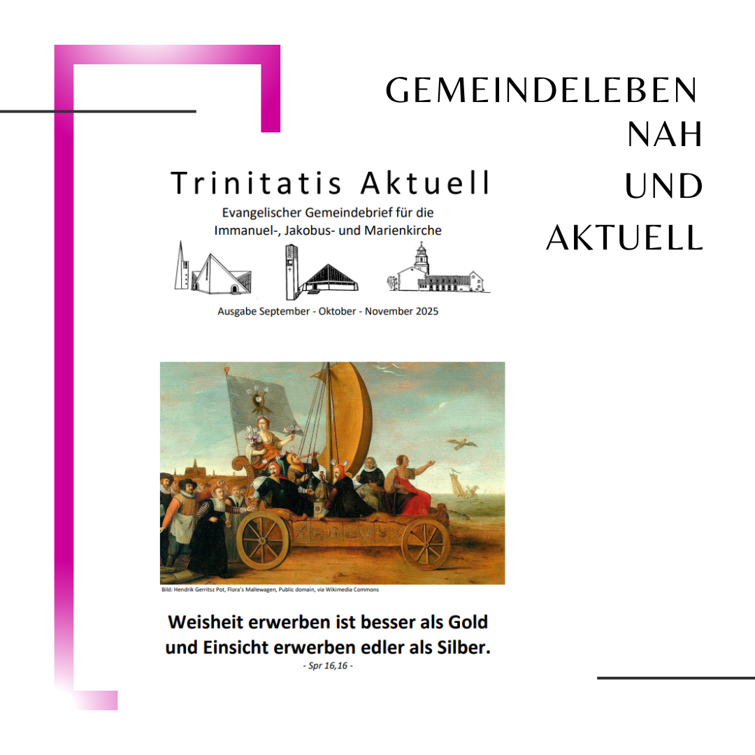 Trinitatis aktuell ist der gemeinsame evangelische Gemeindebrief für die Immanuel-, Jakobus- und Marienkirche. Viermal im Jahr informiert er über das Leben in unseren Gemeinden: aktuelle Veranstaltungen, Gottesdienste, spannende Artikel und vieles mehr.